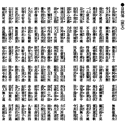 『妙法蓮華経』の第16「如来寿量品」は最初の一句が、「自我得仏来」ではじまっているために『自我偈』とも呼ばれています。そこでは、仏は人々を救済するために仮に地上に姿を現わされたが、本来は永遠の昔から悟りを開いており、この仏の命は永遠であるという立場が取られています。そしてその仏のことを、久遠実成(永遠の昔から仏となっている)の釈迦牟尼仏と呼んでいます。そのことについてのべているのが、この第16章です。この経典は日蓮宗や天台宗の葬儀などでも唱えられています。