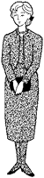 洋装の正式喪服は、黒無地のワンピース、スーツ、アンサンブルです。ボタン、バックルは、共布か光沢のない共色にします。黒は飾りのない黒のパンプスが正式です。アクセサリーは結婚指輪以外はつけないのが本来です。 |